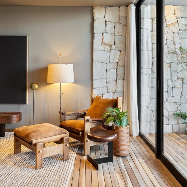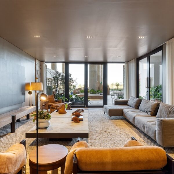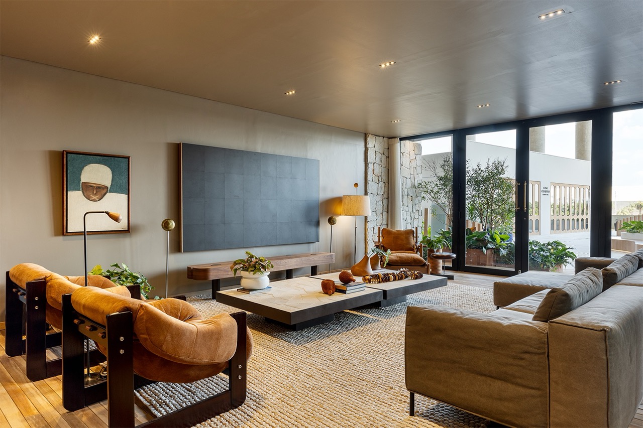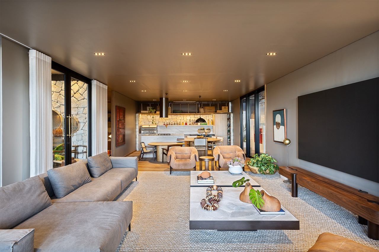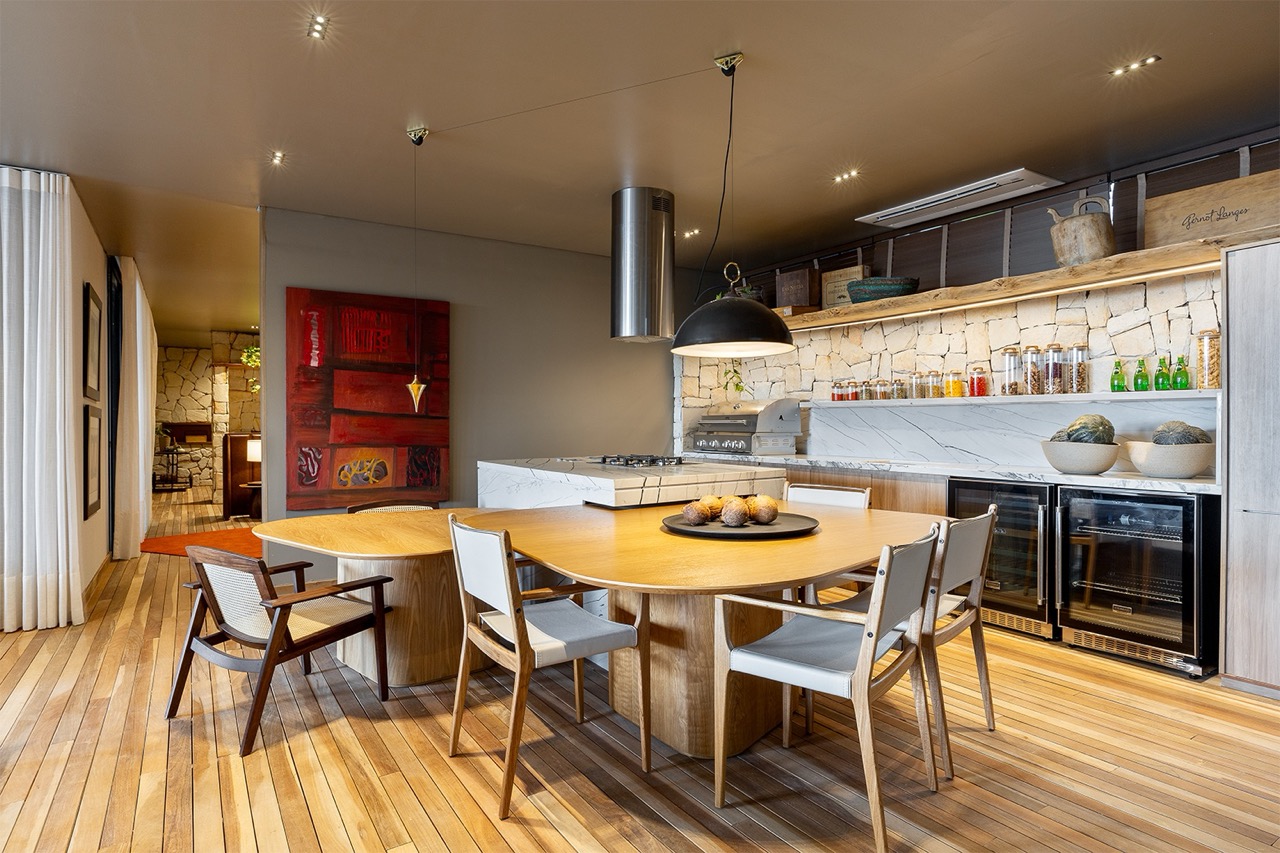 Os ambientes internos — amplos, acolhedores e permeados por texturas naturais — revelam a atmosfera da casa: um espaço que abraça, aquece e dialoga com o exterior. Cozinha, estar e suíte se unem em uma linguagem envolvente, onde cores terrosas, móveis de design e luz difusa criam uma sensação de refúgio sofisticado.