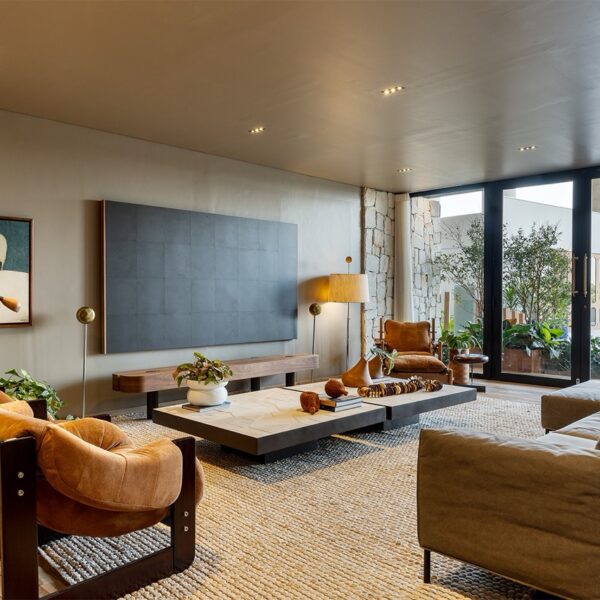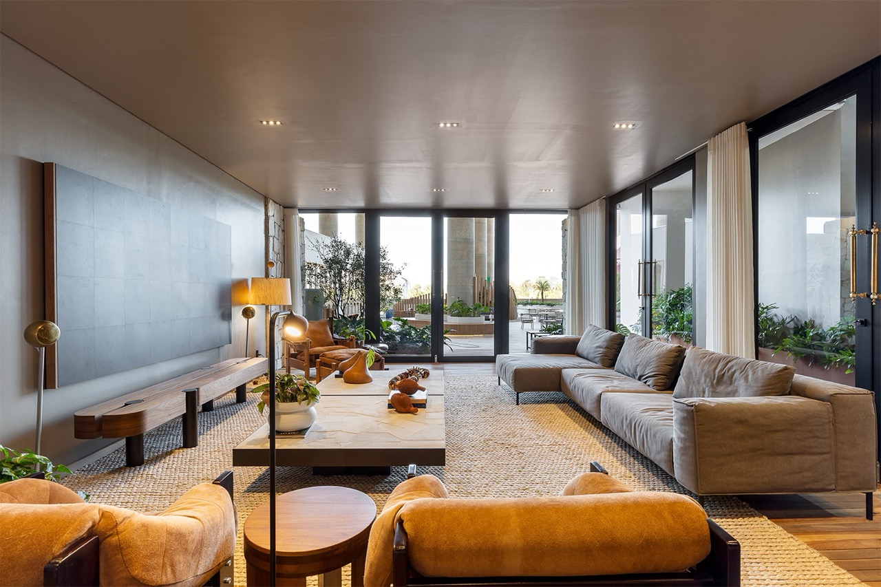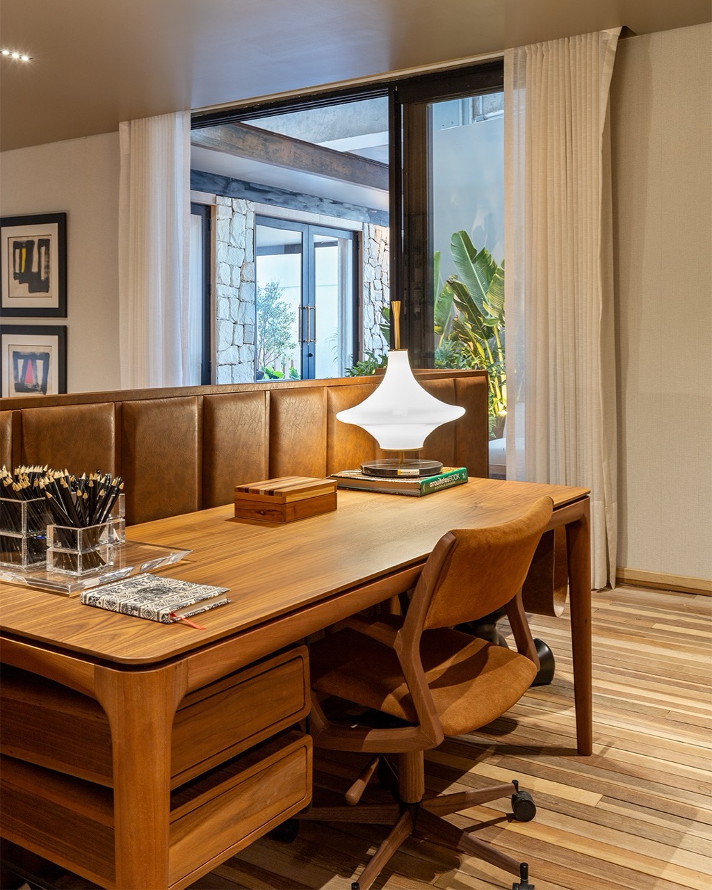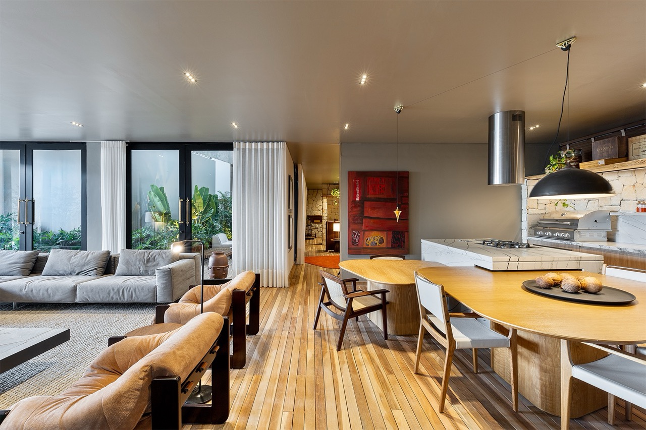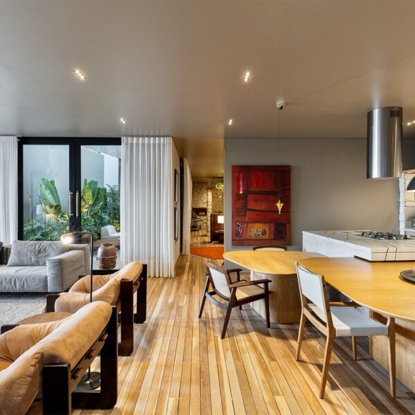 Os ambientes internos — amplos, acolhedores e permeados por texturas naturais — revelam a atmosfera da casa: um espaço que abraça, aquece e dialoga com o exterior. Cozinha, estar e suíte se unem em uma linguagem envolvente, onde cores terrosas, móveis de design e luz difusa criam uma sensação de refúgio sofisticado.
