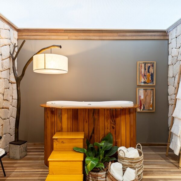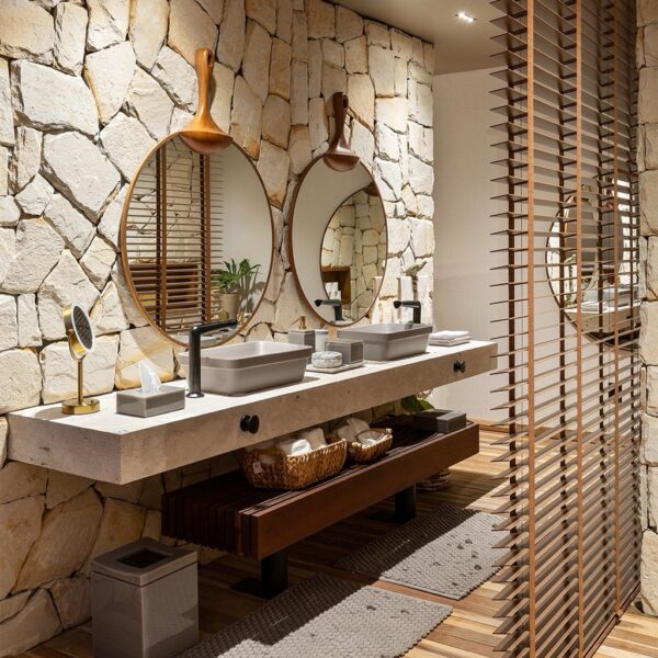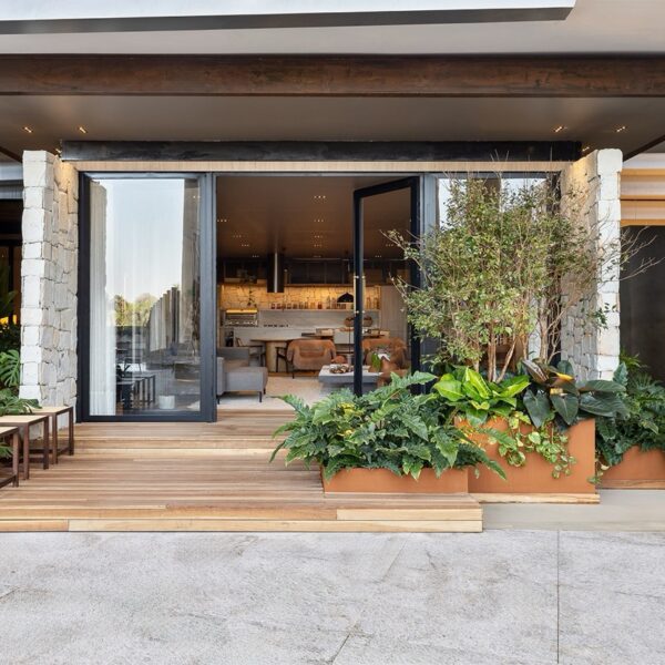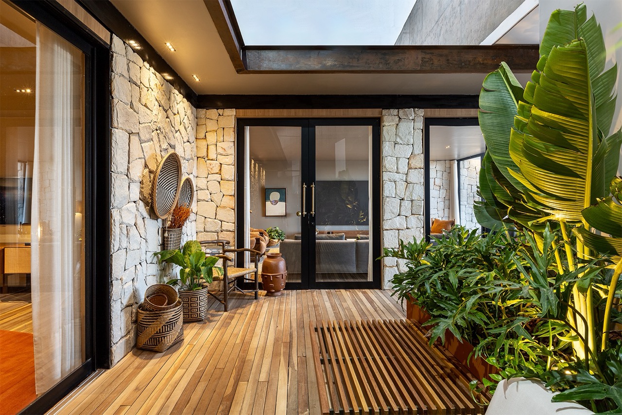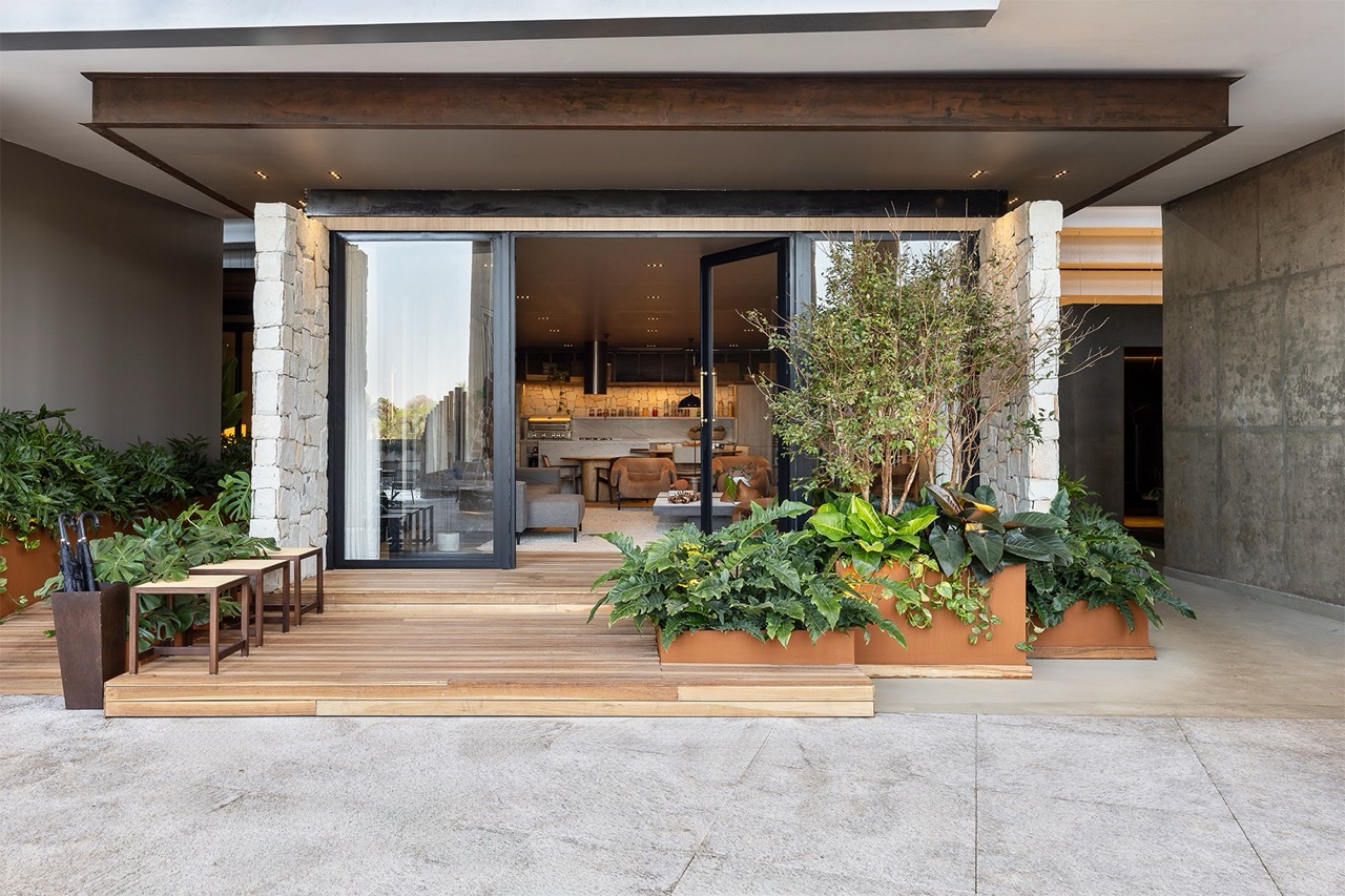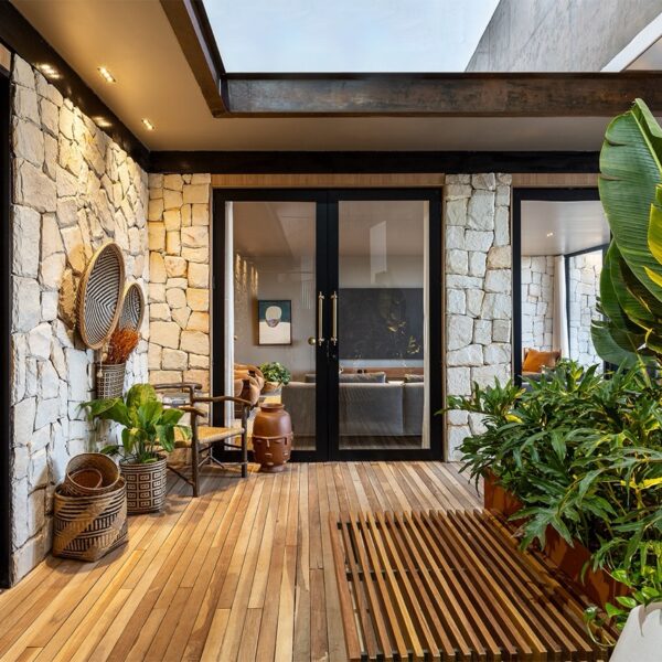 As áreas externas, marcadas por jardins, deck em madeira e grandes aberturas, reforçam o propósito do projeto: integrar pessoas, natureza e arquitetura em um único movimento. Do paisagismo à execução das paredes de pedra, cada detalhe foi construído para entregar a sensação de “casa viva”, acolhedora e atemporal.