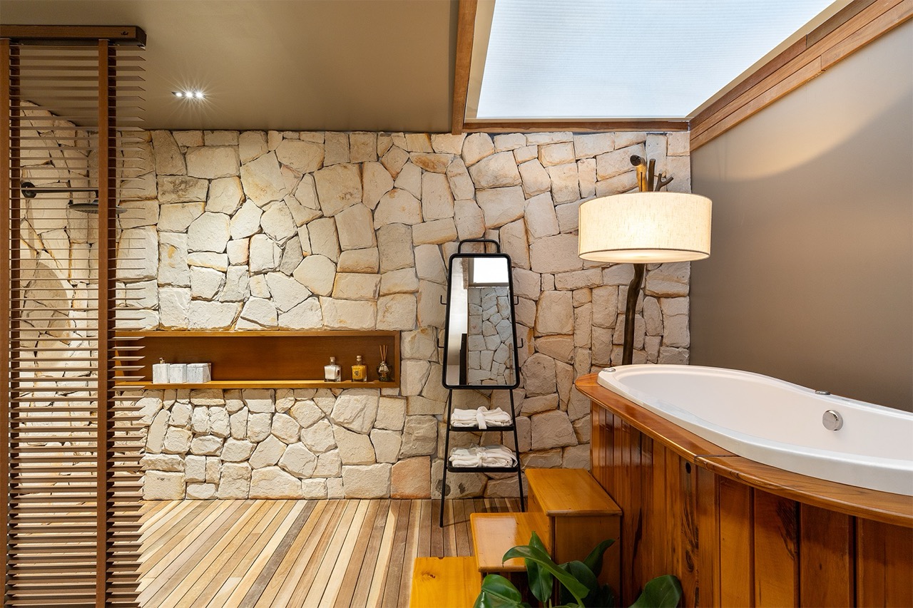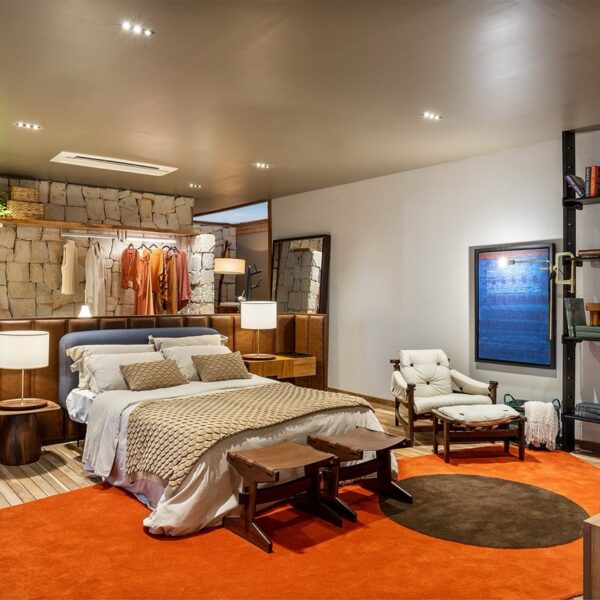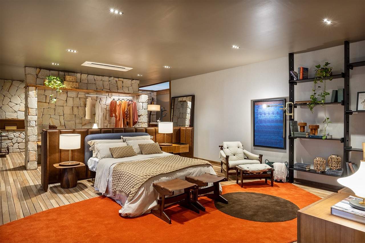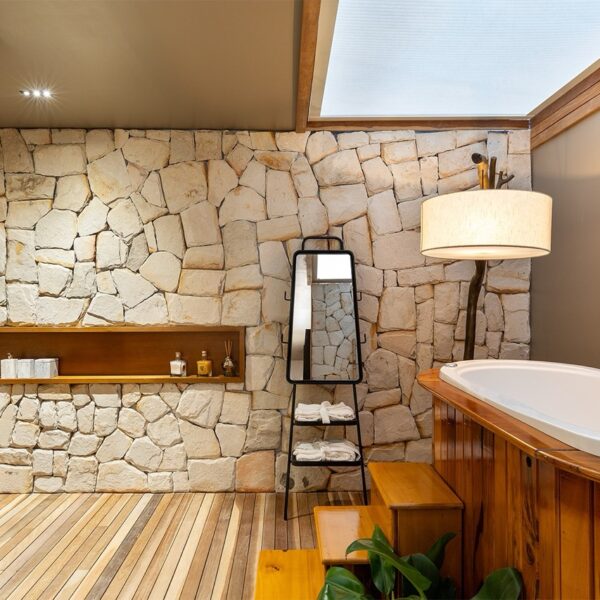 O uso expressivo da pedra bruta, aliado à marcenaria de caráter orgânico e à iluminação cuidadosamente posicionada, exigiu processos minuciosos de instalação e integração. Cada paginação de piso, cada forro contínuo, cada encontro entre madeira, pedra e estruturas metálicas foi trabalhado com rigor técnico para garantir continuidade visual e durabilidade.