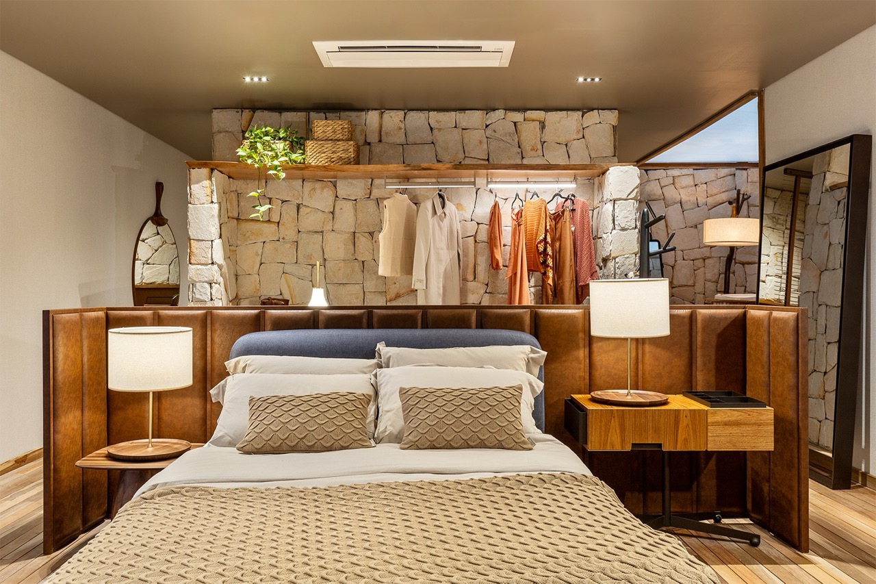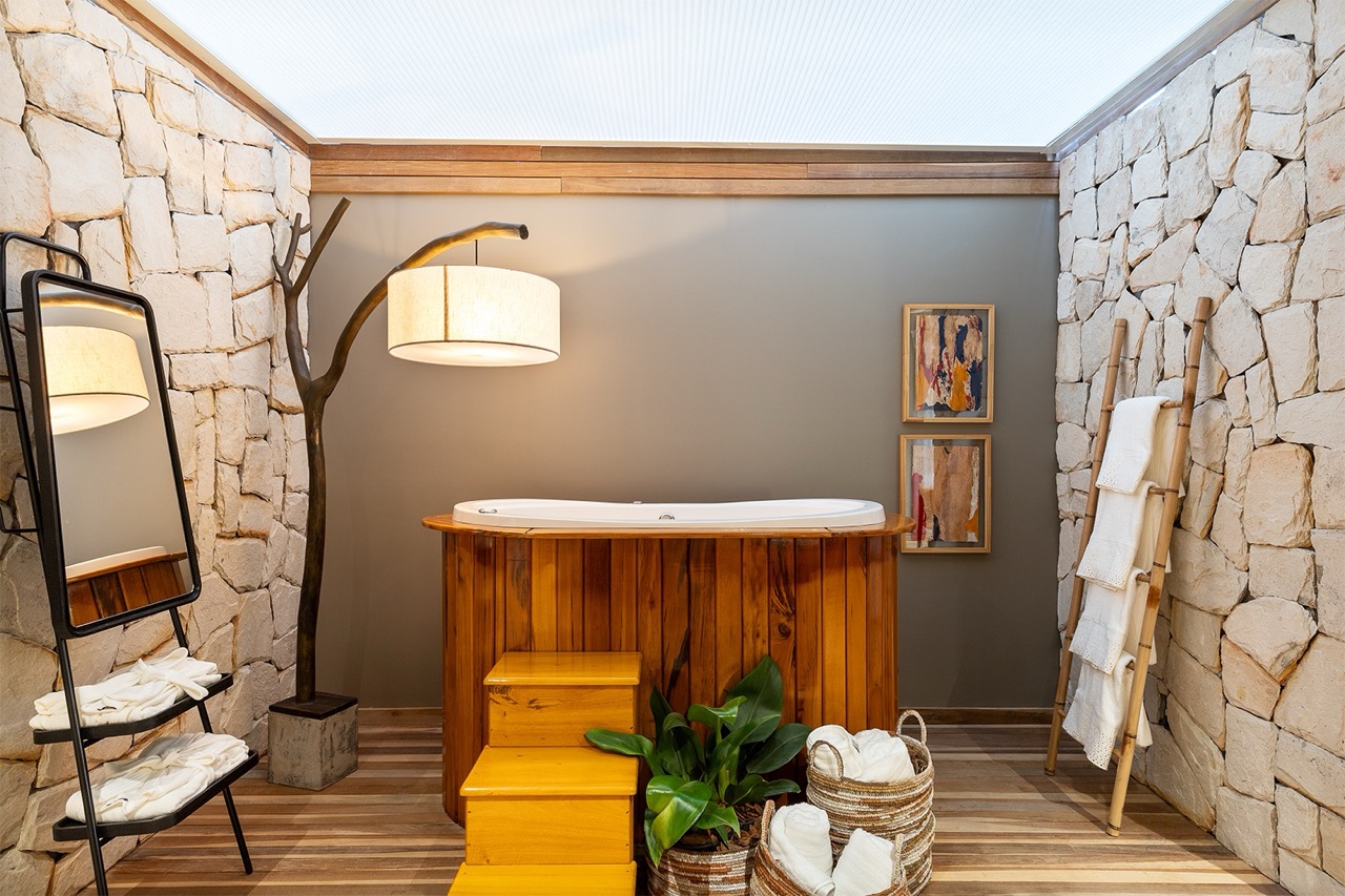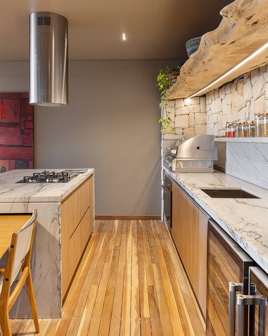 O uso expressivo da pedra bruta, aliado à marcenaria de caráter orgânico e à iluminação cuidadosamente posicionada, exigiu processos minuciosos de instalação e integração. Cada paginação de piso, cada forro contínuo, cada encontro entre madeira, pedra e estruturas metálicas foi trabalhado com rigor técnico para garantir continuidade visual e durabilidade.