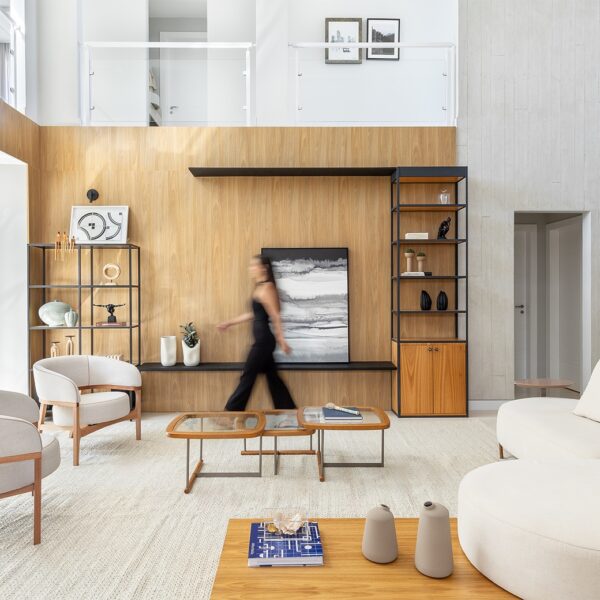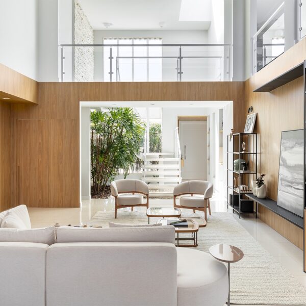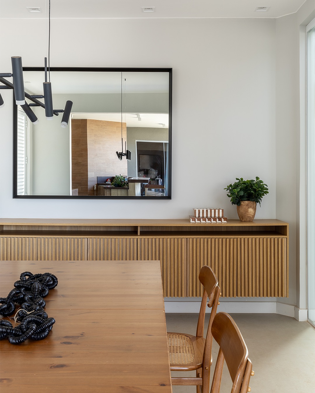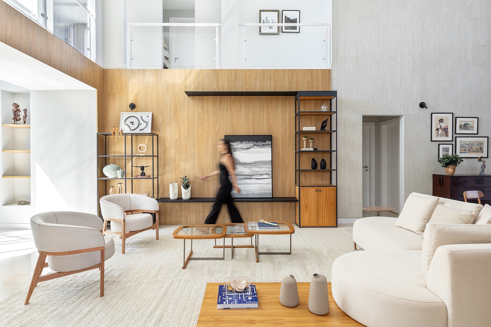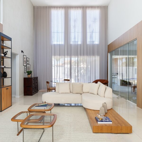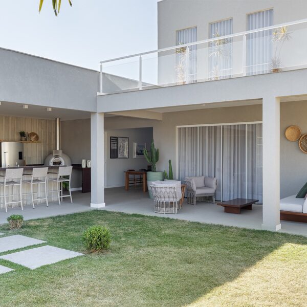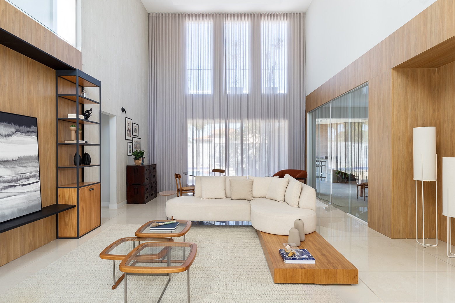 A integração entre os espaços sociais valoriza a convivência familiar e a entrada de luz natural. O uso de painéis amadeirados, linhas limpas e mobiliário sob medida reforça o caráter atemporal da residência, onde cada elemento foi pensado para harmonizar estética e praticidade no dia a dia.