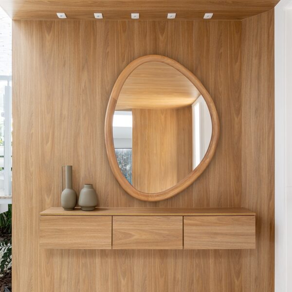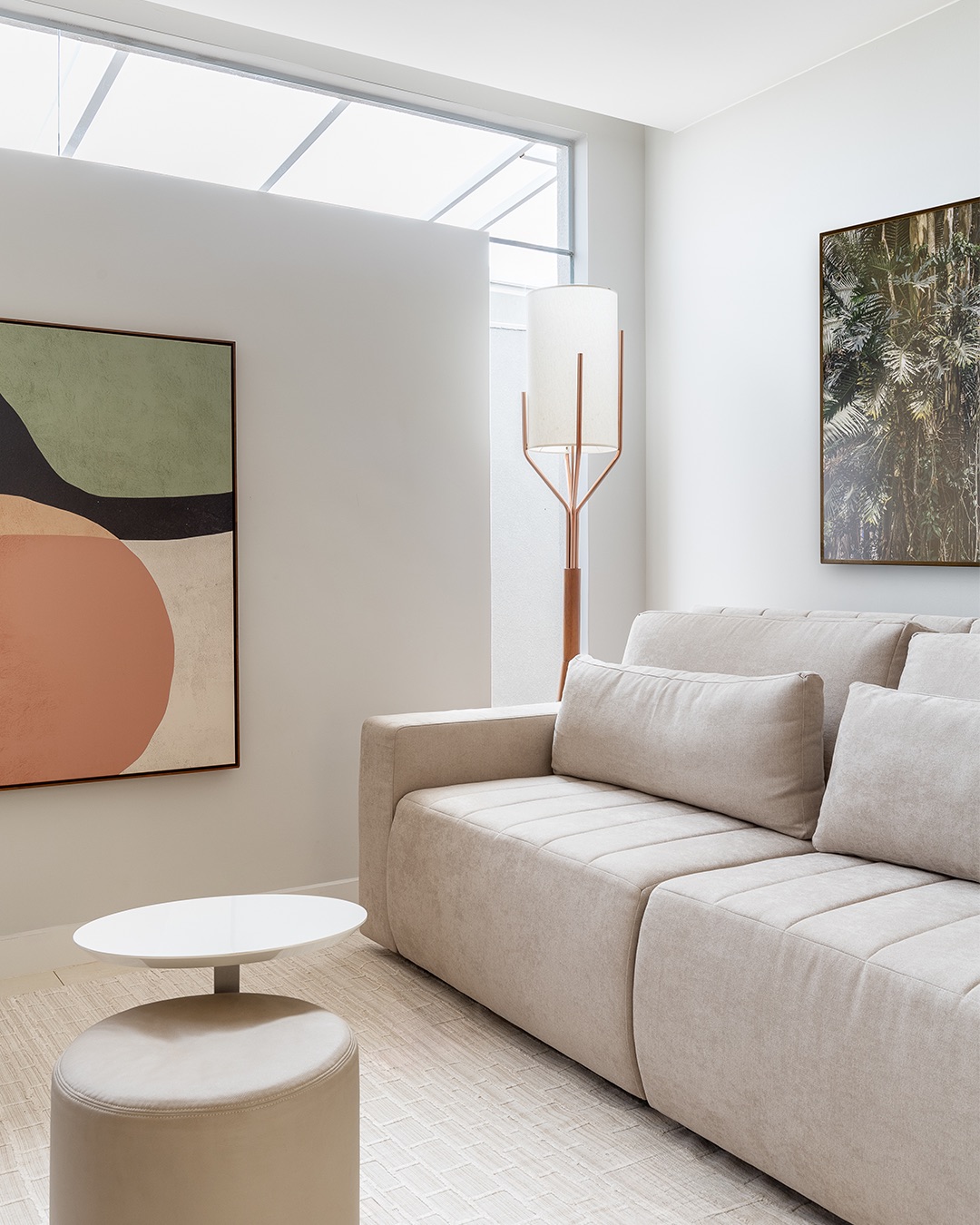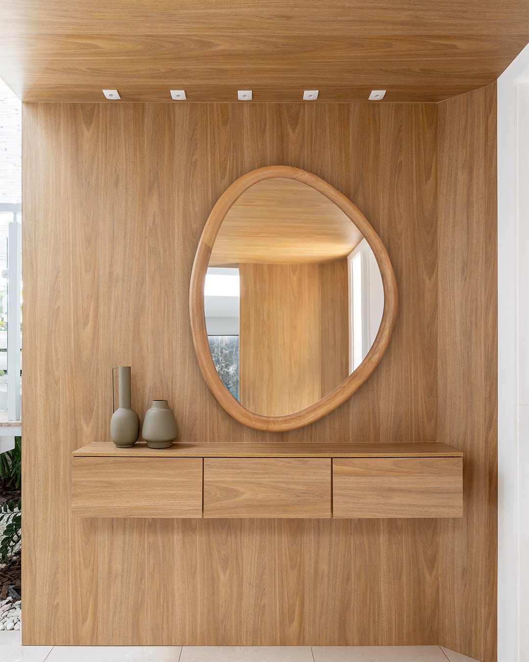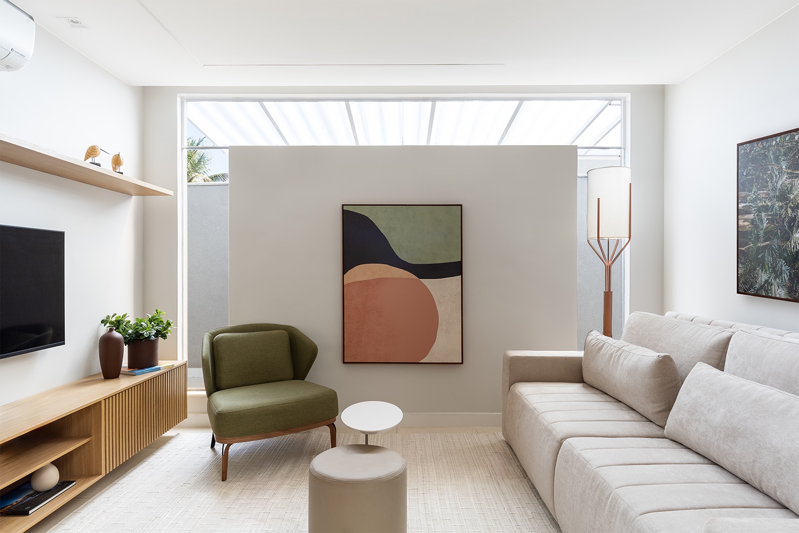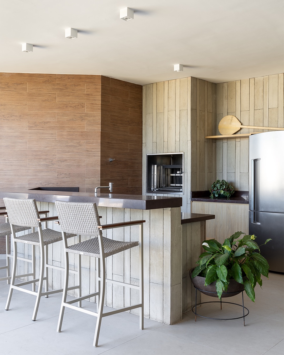 A integração entre os espaços sociais valoriza a convivência familiar e a entrada de luz natural. O uso de painéis amadeirados, linhas limpas e mobiliário sob medida reforça o caráter atemporal da residência, onde cada elemento foi pensado para harmonizar estética e praticidade no dia a dia.